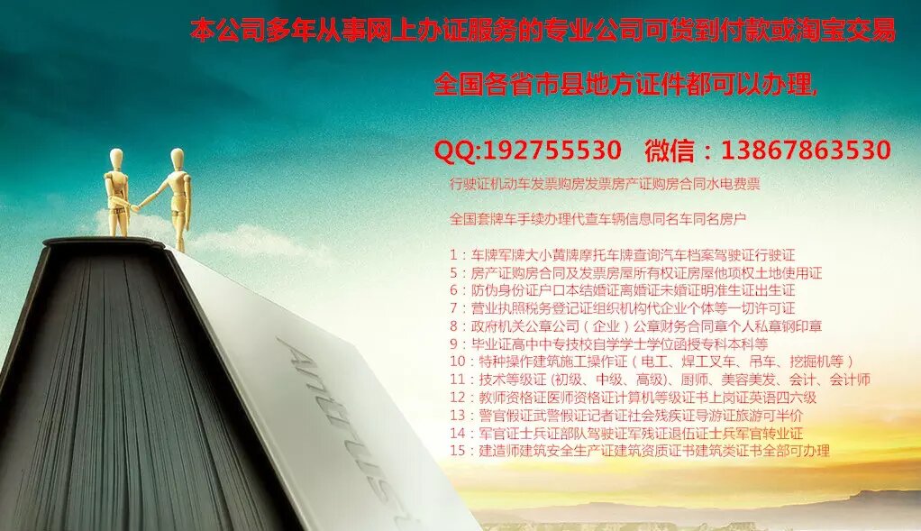 1:本公司多年从事网上办证服务的专业公司可货到付款或淘宝交易 2:本公司办理各类假证件无需缴纳任何【定金 或 风险金】诚信经营 3:经营项目专业印刷国家=地方新出证件票据提前预定 4:车牌军牌大小黄牌摩托车牌查询汽车档案驾驶证行驶证 5:房产证购房合同及发票房屋所有权证房屋他项权土地使用证 6:防伪身份证户口本结婚证离婚证未婚证明准生证出生证 7:营业执照税务登记证组织机构代企业个体等一切许可证 8:政府机关公章公司(企业)公章财务合同章个人私章钢印章 9:毕业证高中中专技校自学学士学位函授专科本科等 10:特种操作建筑施工操作证(电工、焊工叉车、吊车、挖掘机等) 11:技术等级证 (初级、中级、高级)、厨师、美容美发、会计、会计师 12:教师资格证医师资格证计算机等级证书上岗证英语四六级 13:警官假证武警假证记者证社会残疾证导游证旅游可半价 14:军官证士兵证部队驾驶证军残证退伍证士兵军官转业证 15:建造师建筑安全生产证建筑资质证书建筑类证书全部可办理 16:专业办理机动车发票/汽车大本办理